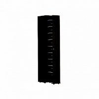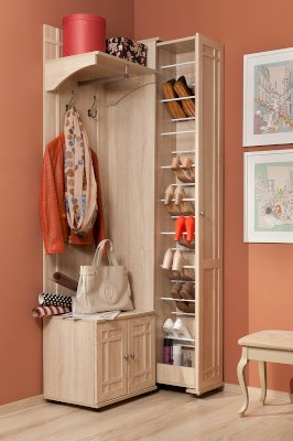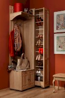 Высокая и узкая обувница - уникальное предложение на рынке мебели. Узкий (300 мм), но высокий (2125 мм) он вмещает до 18 пар обуви, а также средства по уходу за ней. Предусмотрены варианты перестановки стальных прутков-держателей для хранения маленькой детской обуви. Для этого в 2-х верхних и 2-х нижних рядах предусмотрена дополнительная присадка в центре для переноса стальных прутков ближе друг к другу. Шкаф выдвигается без усилий благодаря шариковым направляющим полного выдвижения и выкатным роликам.