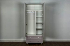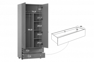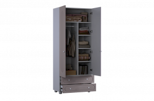 Слева внутри шкафа расположена штанга для плечиков, предназначенная для хранения одежды на вешалках. Правая часть оборудована полками, которые подойдут для аккуратного размещения сложенной одежды, коробок или аксессуаров. В нижней части предусмотрены два вместительных выкатных ящика для хранения, обеспечивающих дополнительное место для вещей повседневного использования.