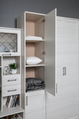 Пенал – идеальная система хранения для гостиной. За дверкой расположены полки. Удачные габариты делают этот пенал вместительным.